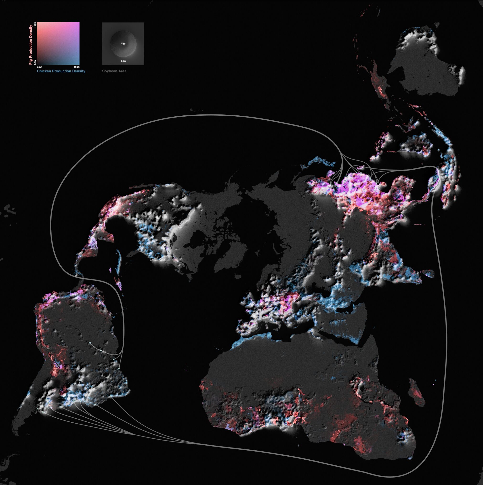 Elements of the Global Industrial Feedlot Matrix with populations of industrial chickens shown in blue and pigs shown in red.
