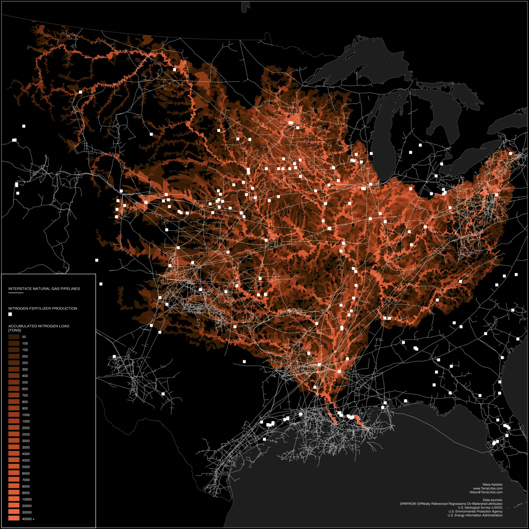 Visualization of the “3/4 Coast,” an engineered and invented territory comprisin the watery geographies of Chicago and the Great Lakes– the so-called “Third Coast” of the United States– and their conjuncture with the Mississippi River watershed– the “Fourth Coast.” Produced as a thematic graphic for Introduction to Critical Spatial Media, Autumn 2023.